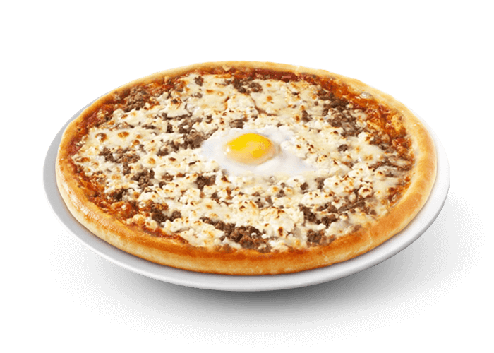 Tomate, mozzarella fior di latte, boeuf haché, champignons, oeuf.