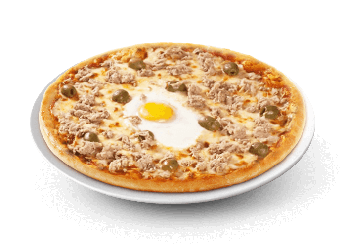 Tomate, mozzarella fior di latte, thon, poivrons, oignons rouges, olives vertes pimentées, oeuf.