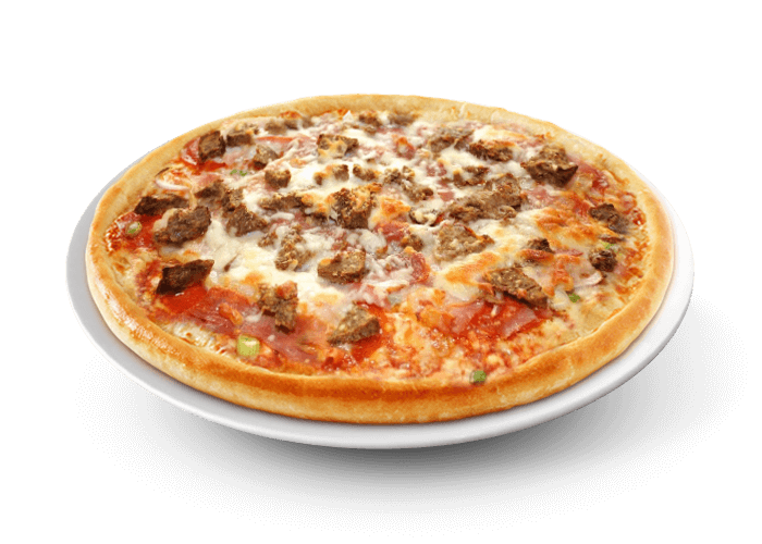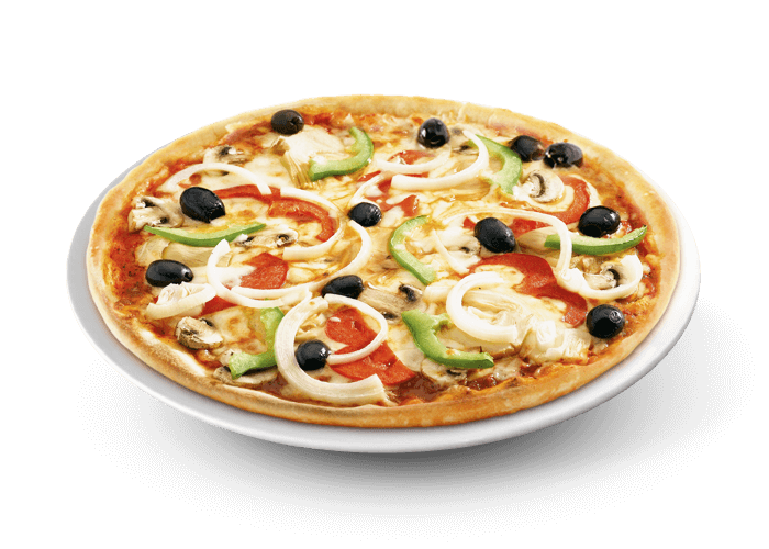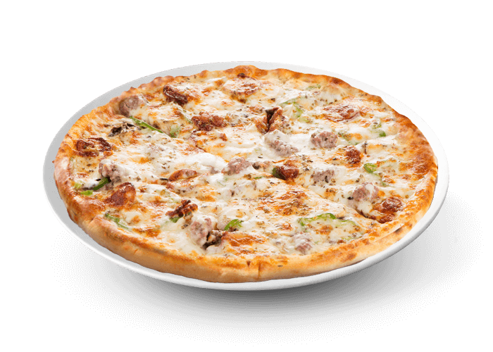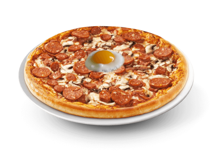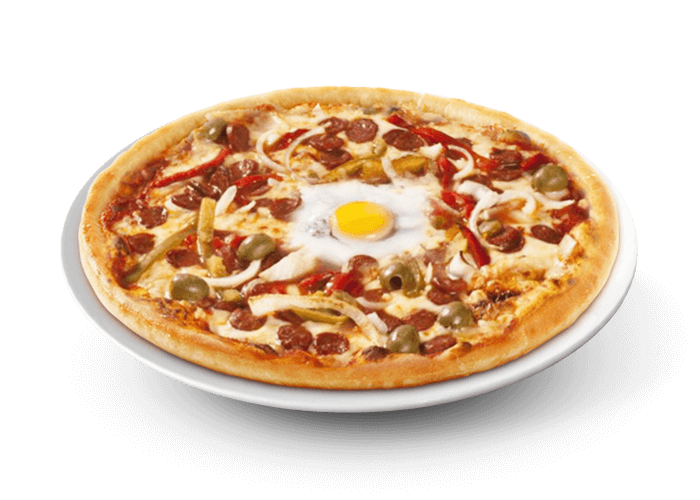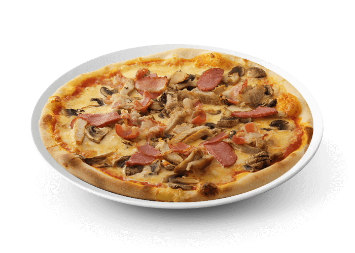 Tomate, mozzarella fior di latte, jambon, merguez, chorizo, oeuf, champignons, poivrons.