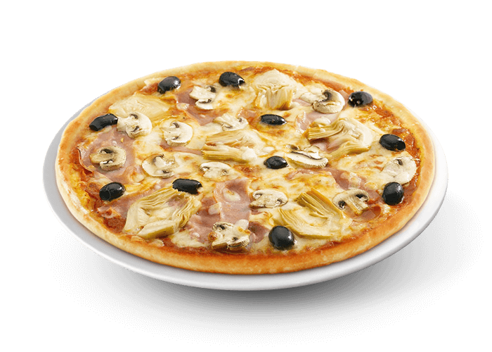 Tomate, mozzarella fior di latte, jambon, champignons, artichauts et poivrons marinés, olives.